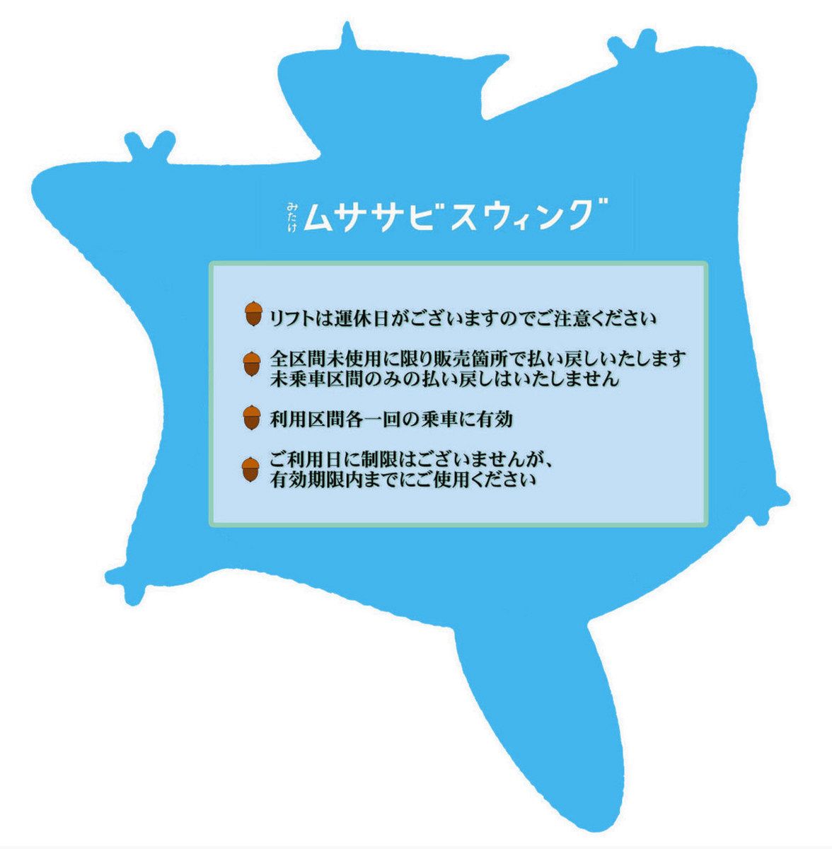 イベントでは、今年6月に山頂近くに設置された2人乗り展望ブランコ「みたけムササビスウィング」をデザインした限定記念乗車券を販売。ケーブルカーと観光リフトの往復乗車券で大人1390円。限定500枚。