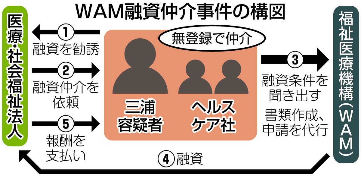 捜査関係者によると、三浦被告らは無登録で貸金業を営み、約40の医療法人などにWAMの「新型コロナウイルス対応支援金」の貸し付けを受けるよう勧誘。計64億5000万円の融資に関与し約5億円の手数料を不正に得たとみられる。