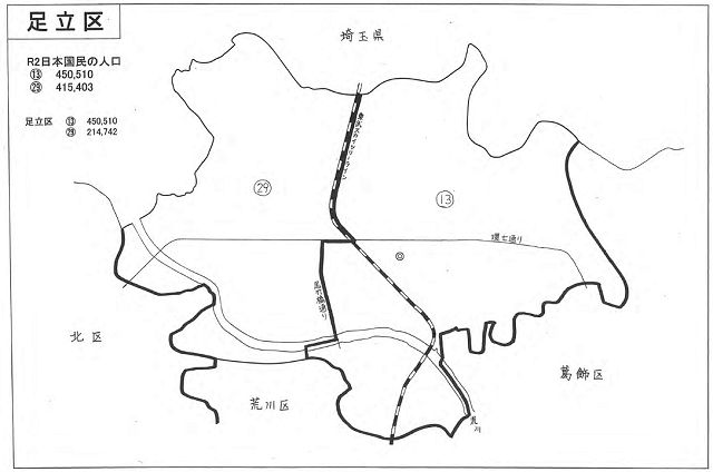 青井一丁目、青井二丁目、青井三丁目、青井四丁目、青井五丁目、青井六丁目、足立一丁目、足立二丁目、足立三丁目、足立四丁目、綾瀬一丁目、綾瀬二丁目、綾瀬三丁目、綾瀬四丁目、綾瀬五丁目、綾瀬六丁目、綾瀬七丁目、梅島一丁目、梅島二丁目、梅島三丁目、梅田一丁目、梅田二丁目、梅田三丁目、梅田四丁目、梅田五丁目、梅田六丁目、梅田七丁目、梅田八丁目、大谷田一丁目、大谷田二丁目、大谷田三丁目、大谷田四丁目、大谷田五丁目、加平一丁目、加平二丁目、加平三丁目、北加平町、栗原一丁目、栗原二丁目、弘道一丁目、弘道二丁目、佐野一丁目、佐野二丁目、島根一丁目、島根二丁目、島根三丁目、島根四丁目、神明一丁目、神明二丁目、神明三丁目、神明南一丁目、神明南二丁目、関原一丁目、関原二丁目、関原三丁目、千住一丁目、千住二丁目、千住三丁目、千住四丁目、千住五丁目、千住町、千住旭町、千住東一丁目、千住東二丁目、千住大川町、千住河原町、千住寿町、千住桜木一丁目、千住桜木二丁目、千住関屋町、千住龍田町、千住中居町、千住仲町、千住橋戸町、千住緑町一丁目、千住緑町二丁目、千住緑町三丁目、千住宮元町、千住元町、千住柳町、竹の塚一丁目、竹の塚二丁目、竹の塚三丁目、竹の塚四丁目、竹の塚五丁目、竹の塚六丁目、竹の塚七丁目、辰沼一丁目、辰沼二丁目、中央本町一丁目、中央本町二丁目、中央本町三丁目、中央本町四丁目、中央本町五丁目、東和一丁目、東和二丁目、東和三丁目、東和四丁目、東和五丁目、中川一丁目、中川二丁目、中川三丁目、中川四丁目、中川五丁目、西綾瀬一丁目、西綾瀬二丁目、西綾瀬三丁目、西綾瀬四丁目、西新井栄町一丁目、西新井栄町二丁目、西加平一丁目、西加平二丁目、西保木間一丁目、西保木間二丁目、西保木間三丁目、西保木間四丁目、花畑一丁目、花畑二丁目、花畑三丁目、花畑四丁目、花畑五丁目、花畑六丁目、花畑七丁目、花畑八丁目、東綾瀬一丁目、東綾瀬二丁目、東綾瀬三丁目、東保木間一丁目、東保木間二丁目、東六月町、一ツ家一丁目、一ツ家二丁目、一ツ家三丁目、一ツ家四丁目、日ノ出町、平野一丁目、平野二丁目、平野三丁目、保木間一丁目、保木間二丁目、保木間三丁目、保木間四丁目、保木間五丁目、保塚町、南花畑一丁目、南花畑二丁目、南花畑三丁目、南花畑四丁目、南花畑五丁目、六木一丁目、六木二丁目、六木三丁目、六木四丁目、谷中一丁目、谷中二丁目、谷中三丁目、谷中四丁目、谷中五丁目、柳原一丁目、柳原二丁目、六月一丁目、六月二丁目、六月三丁目、六町一丁目、六町二丁目、六町三丁目、六町四丁目