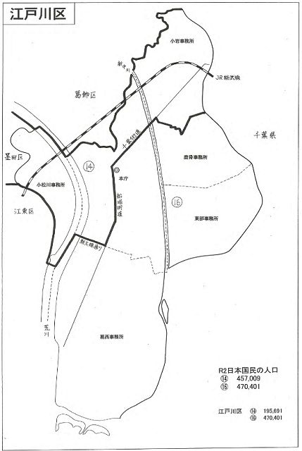 本庁管内の中央四丁目、松島一丁目、松島二丁目、松島三丁目、松島四丁目、東小松川一丁目、東小松川二丁目、東小松川三丁目、東小松川四丁目、西小松川町、興宮町、上一色一丁目、上一色二丁目、上一色三丁目、本一色一丁目、本一色二丁目、本一色三丁目