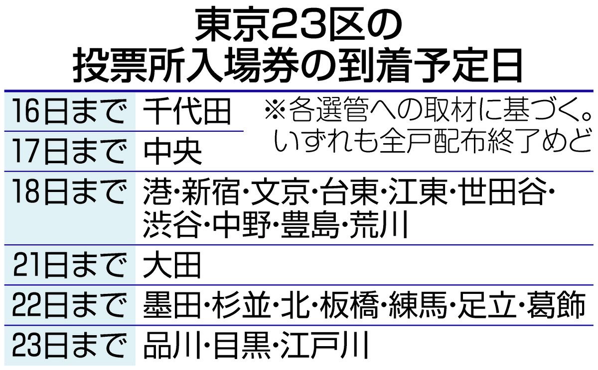東京23区のうち11区で配布が終わっておらず、配布自体が始まっていない板橋、練馬の両区は到着を22日、目黒は23日までと見込む。通常はどの区も期日前投票が始まる前に配布するが、各区の選管は「入場券の印刷などに時間がかかるため、準備期間が足りなかった」と説明する。