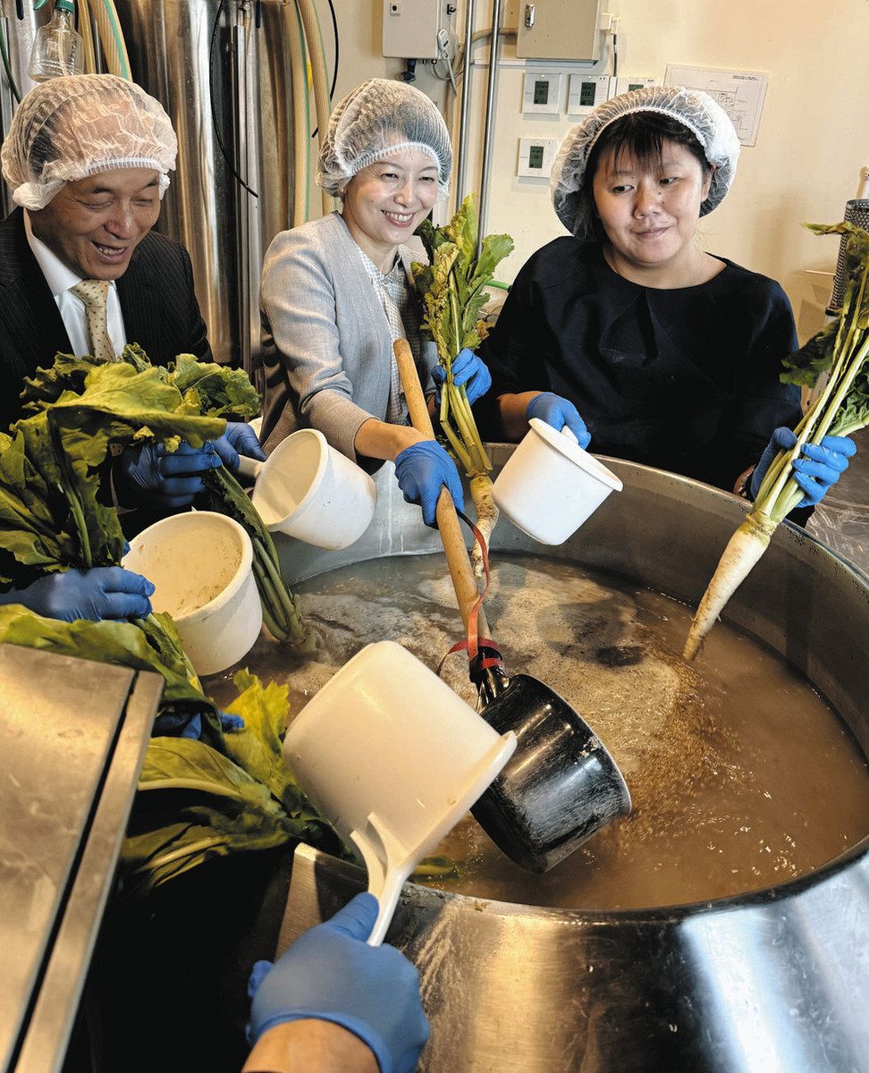 東京都品川区の伝統野菜「品川かぶ」を使った地ビールの仕込み式が17日、大田区羽田空港1の「よい仕事おこしプラザ」などであり、関係者がカブの優しい味わいを生かしたビールの完成を願って材料を仕込んだ。