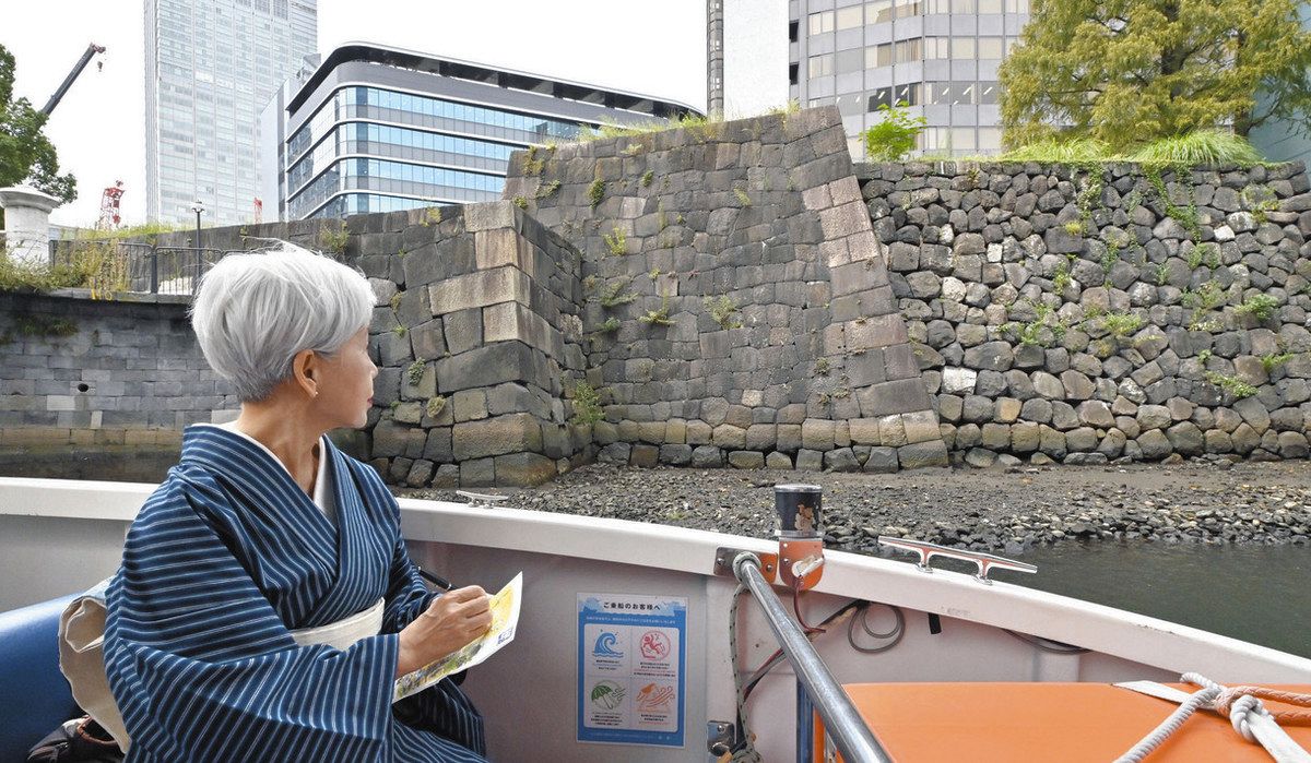 日本橋川のクルーズ船から常盤橋門の石垣を見る田中優子さん=千代田区、中央区で
