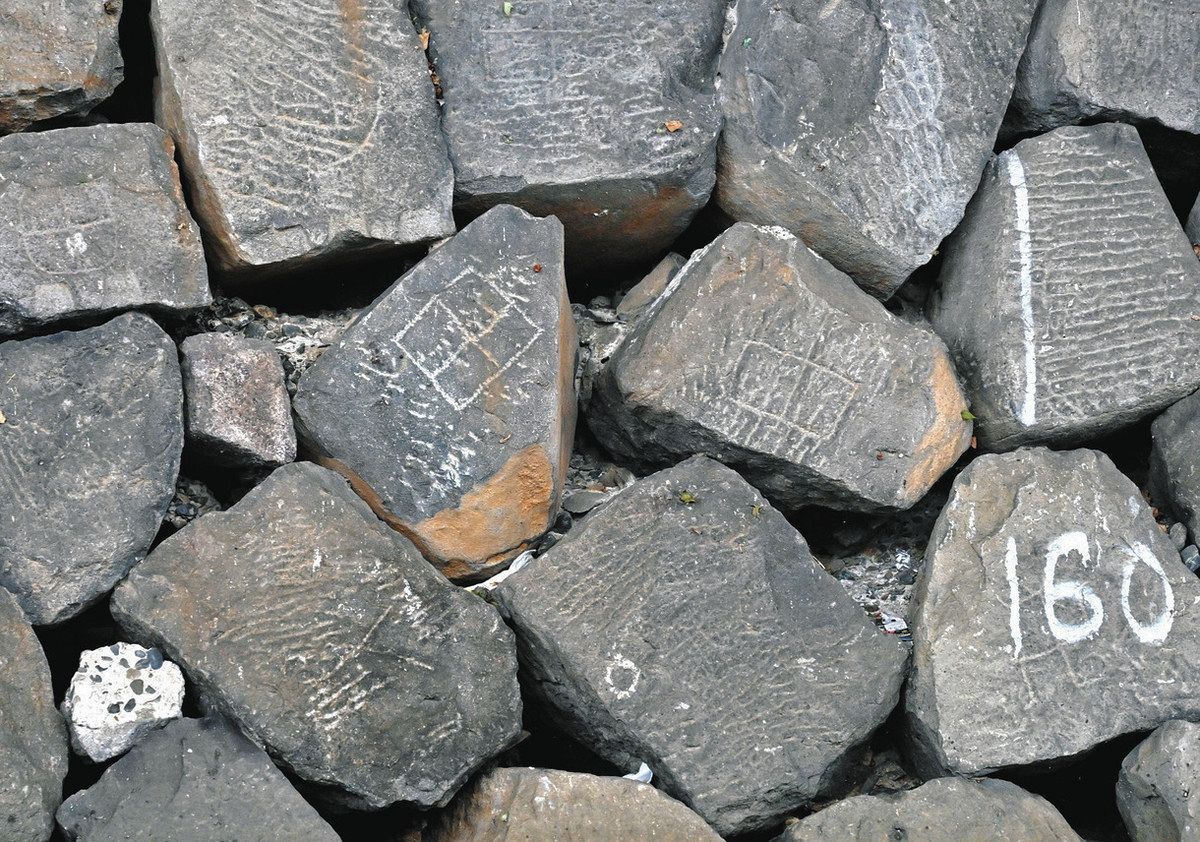 大名家の刻印が残る日本橋川の石垣=千代田区で