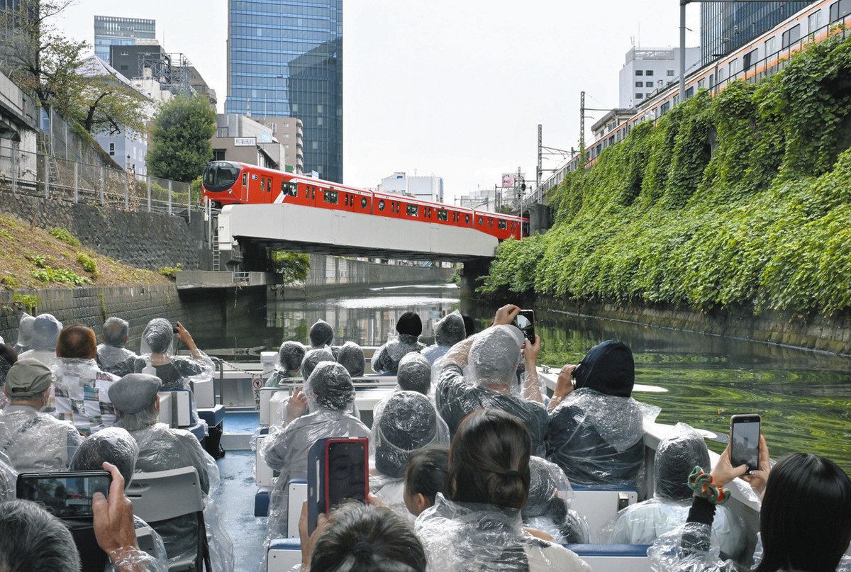 聖橋をくぐり神田川を下るクルーズ船。前方に丸ノ内線と中央線快速の車両が現れた=千代田区、文京区で