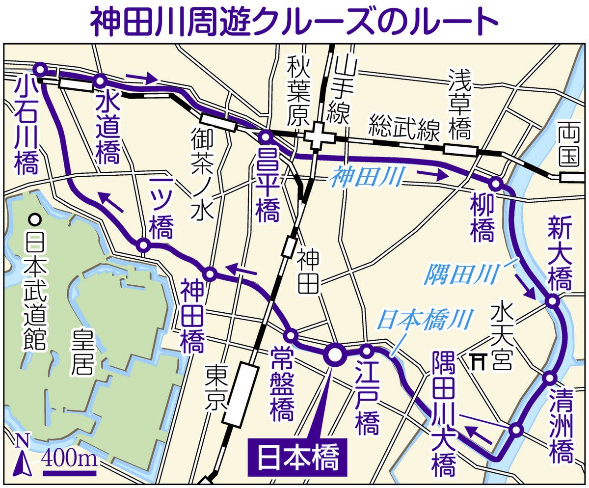 乗合船のひとつ、「日本橋クルーズ」が催行している「神田川周遊クルーズ90分」を予約した。乗船料は、名調子のガイドがついて、平日は1人2500円(土日祝は2800円)。