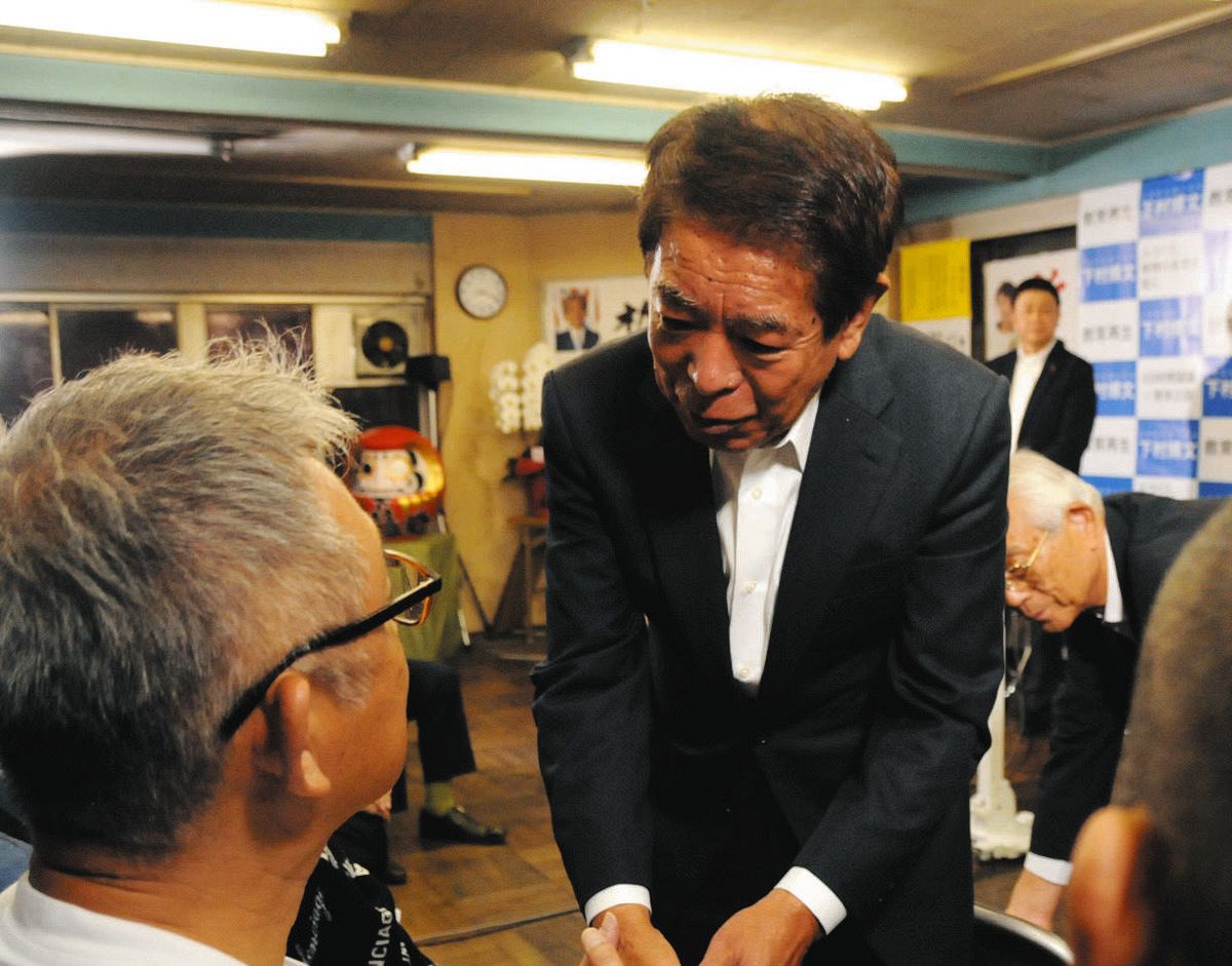 支持者に握手を求め、「すみませんでした」と頭を下げる下村博文さん=27日、東京都板橋区で(西川正志撮影)