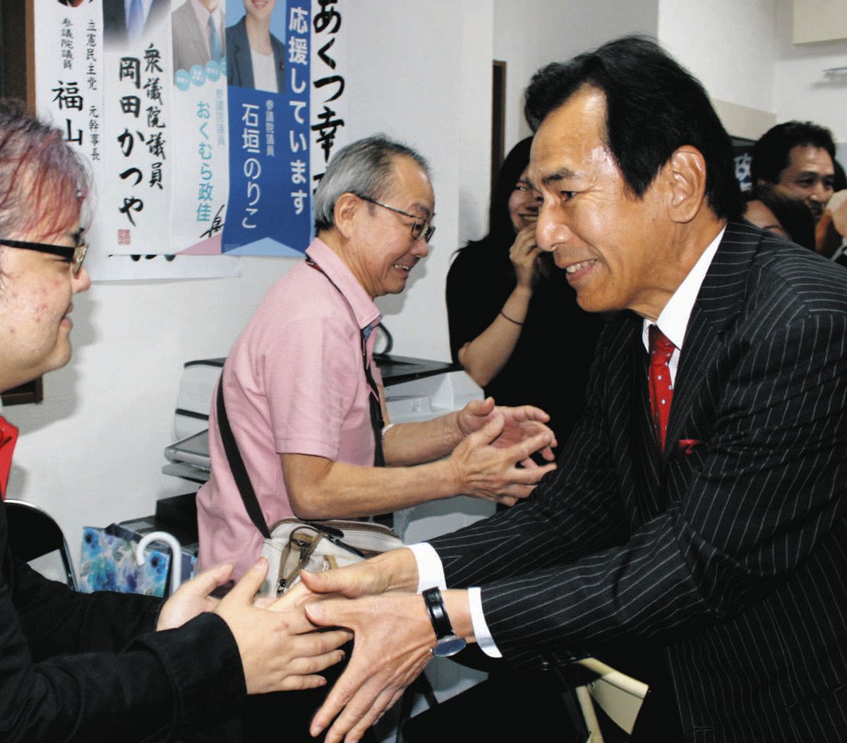 20分後、下村さんが事務所に姿を見せると「申し訳ありませんでした」と深々と頭を下げた。支援者一人一人と握手をしながら「すみません」「申し訳ありません」とおわびを繰り返した。