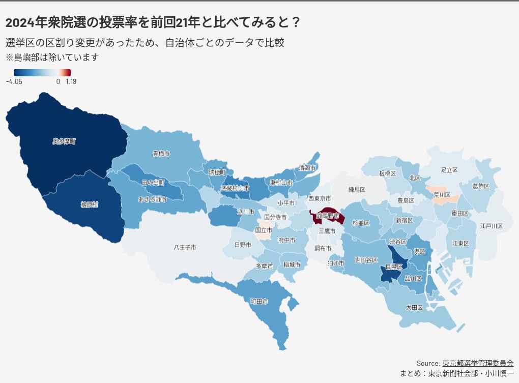 全体的に21年衆院選よりも投票率は下がった。今回、21年を上回ったのは、武蔵野市(62.64%、プラス1.19ポイント)、荒川区(56.26%、プラス0.23ポイント)、国立市(60.99%、プラス0.09ポイント)の3自治体。小笠原村(58.92%)は21年と変わらなかった。