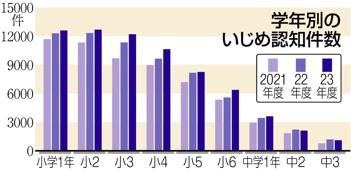 暴力行為の発生件数も、前年度より440件増の3332件と過去最多に。学年別では小学4年、中学1年、高校2年が多い。