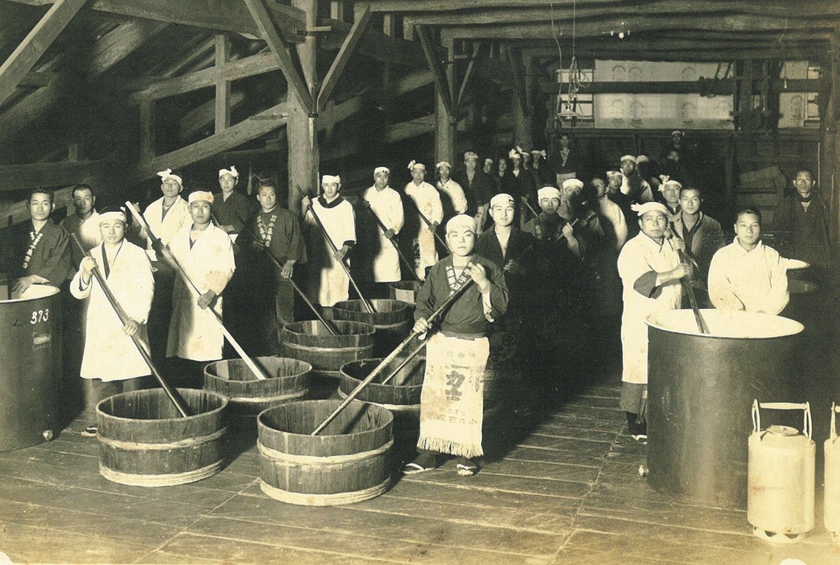 小森久左衛門家騎西本店(現在の釜屋)の杜氏と蔵方(昭和12年ごろ撮影)=滋賀県日野町提供
