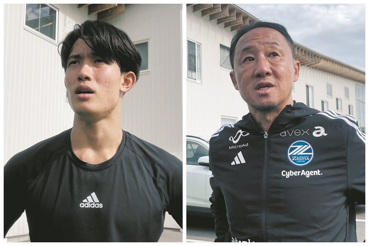 練習後に取材に応じるFC町田ゼルビアのGK谷晃生㊧、黒田剛監督㊨=いずれも1日、東京都町田市で(加藤健太撮影)