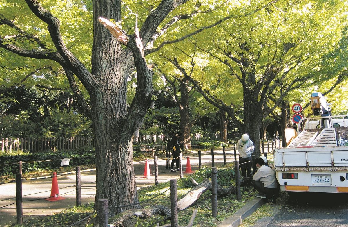 枝が折れたイチョウは、並木の車道側に植えられており、伐採地点とは離れている。6日午前、明治神宮から管理者の都に連絡があった。折れた枝は7日午後に撤去された。