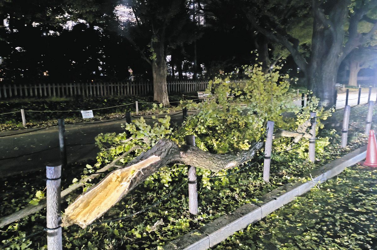 明治神宮外苑で折れて落下したイチョウの枝=6日夜