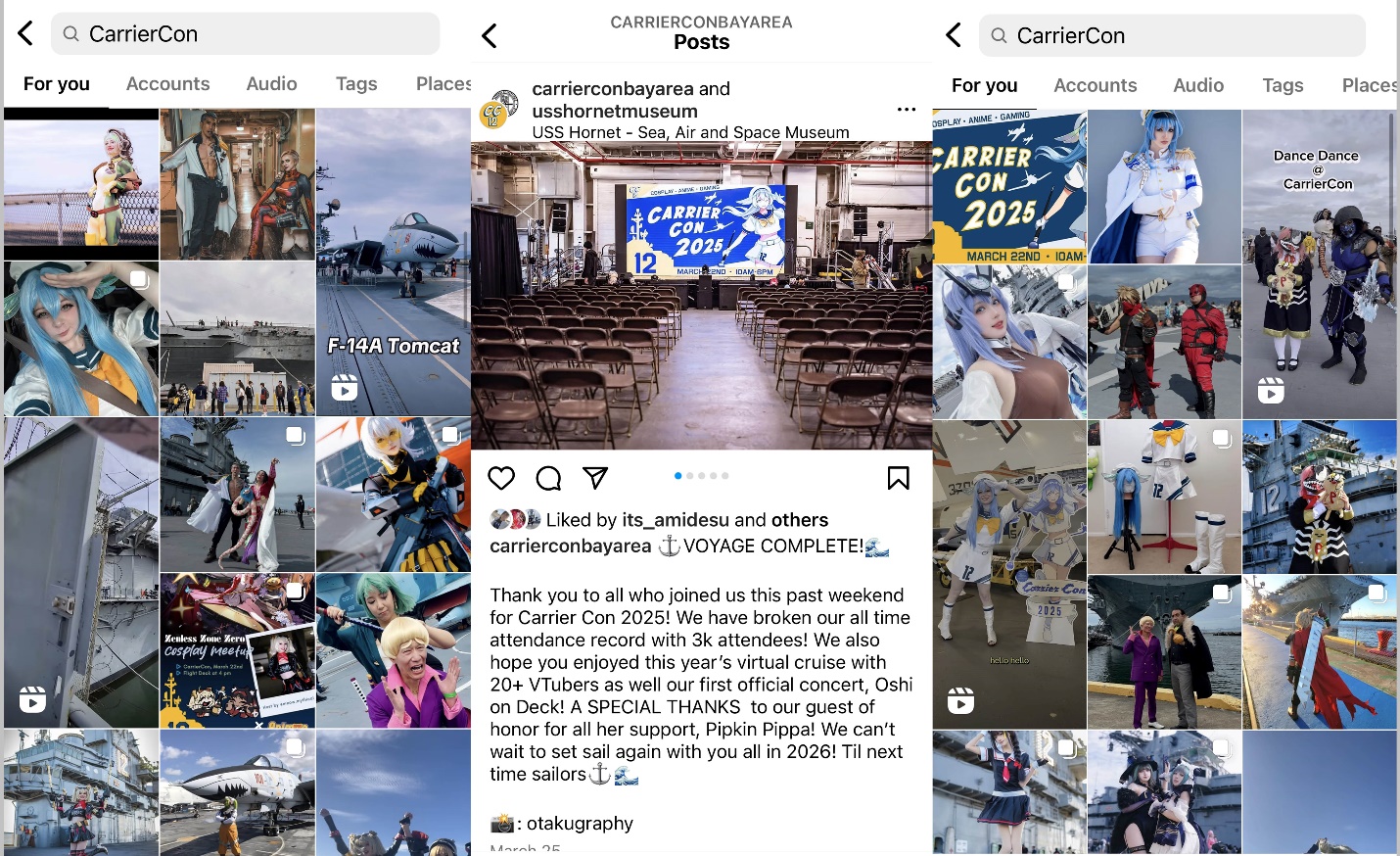 2025年3月、アメリカ・カリフォルニア州アラメダにある国定歴史建造物・USS Hornet Museum(USSホーネット博物館)にて、ACGNに特化した年次イベント「CarrierCon」が開催された。戦艦の歴史と現代のポップカルチャーを融合させたこの試みは、近年大きな注目を集めている。