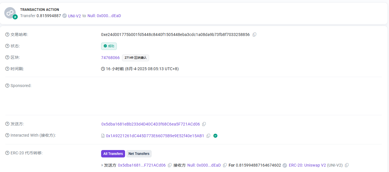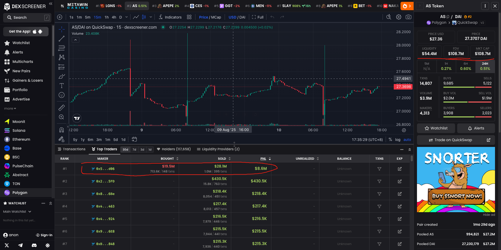 流動性の集中も大きなリスクです。Polygon 上の AS(AKAS トークン、0x6a92…b26e)は QuickSwap の単一 AS/DAI プールでほぼすべて取引されます。オンチェーンデータは短期出来高・TVL・FDV が1つのプールに集中していることを示します。天気が良ければ安定して見えますが、薄氷の上の安定です。ウォレット 0x5dba…ACd06 がこのプールと頻繁にやり取りし、大規模な DAI→AS スワップを繰り返しています。つまり、市場の命綱がごく少数の手に握られています。
